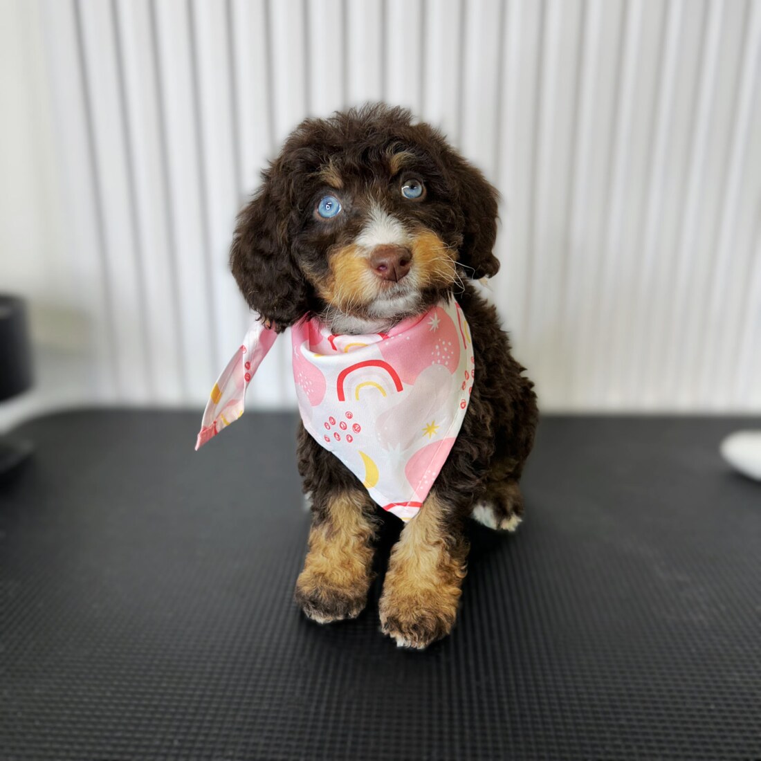 Meet Aurora—the biggest pup in the bunch with the sweetest, calmest personality! This beautiful brown phantom girl has icy blue eyes and a soft, wavy coat with just a touch of curl. She’s affectionate, smart, and loves to snuggle. Aurora did wonderfully at her first groom and was a superstar at the vet. She’s ready to go home this weekend and will make the perfect gentle companion!